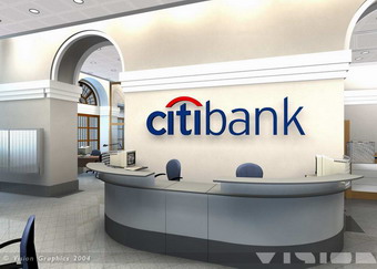 Belső kép: Citibank ügyféltéri pult fotorealisztikus látványterve semleges környezetben